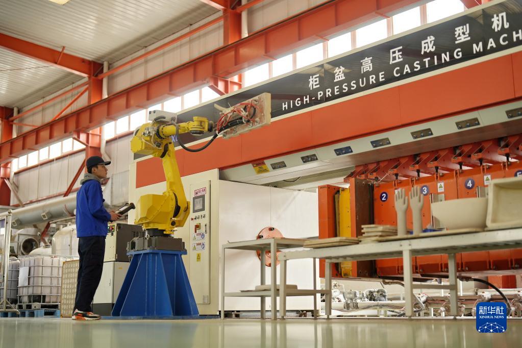4月14日,工人在唐山賀祥智能科技股份有限公司車(chē)間調試機器人產(chǎn)品。