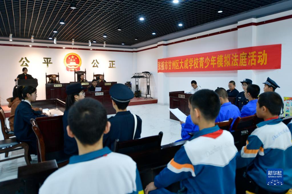 4月14日,在張掖市甘州區大成學(xué)校,學(xué)生們通過(guò)觀(guān)看模擬法庭活動(dòng)增強法制觀(guān)念。