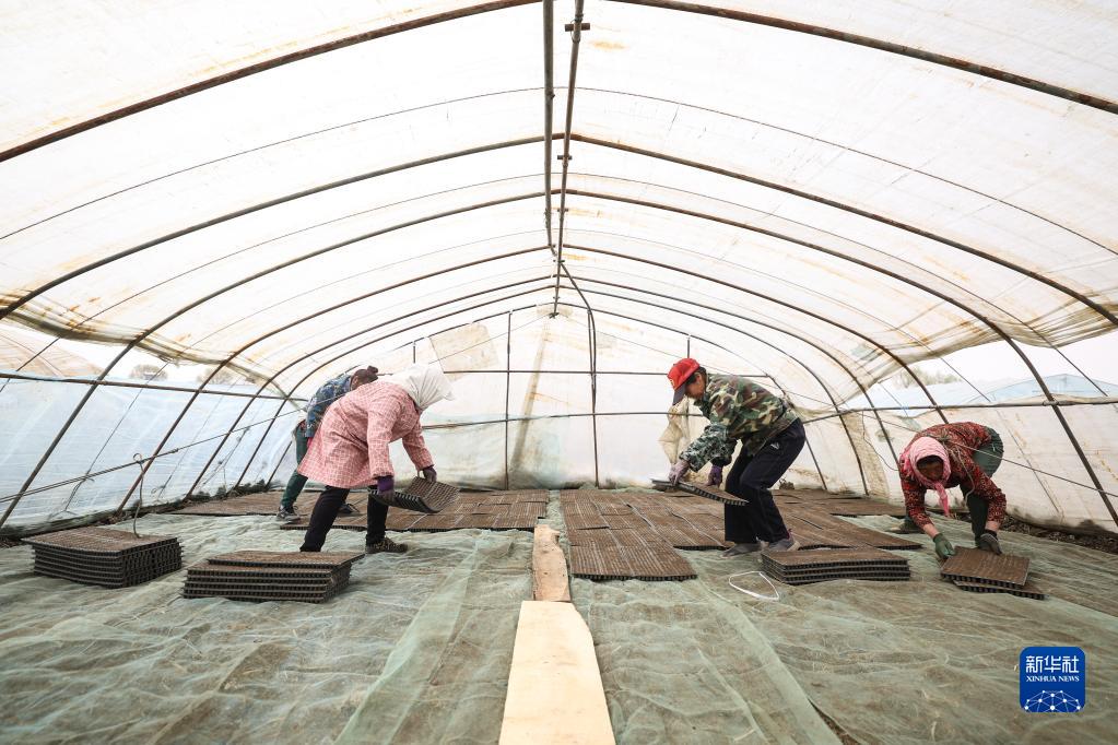 4月14日,盤(pán)錦市盤(pán)山縣的農戶(hù)在進(jìn)行水稻秧苗育苗工作。
