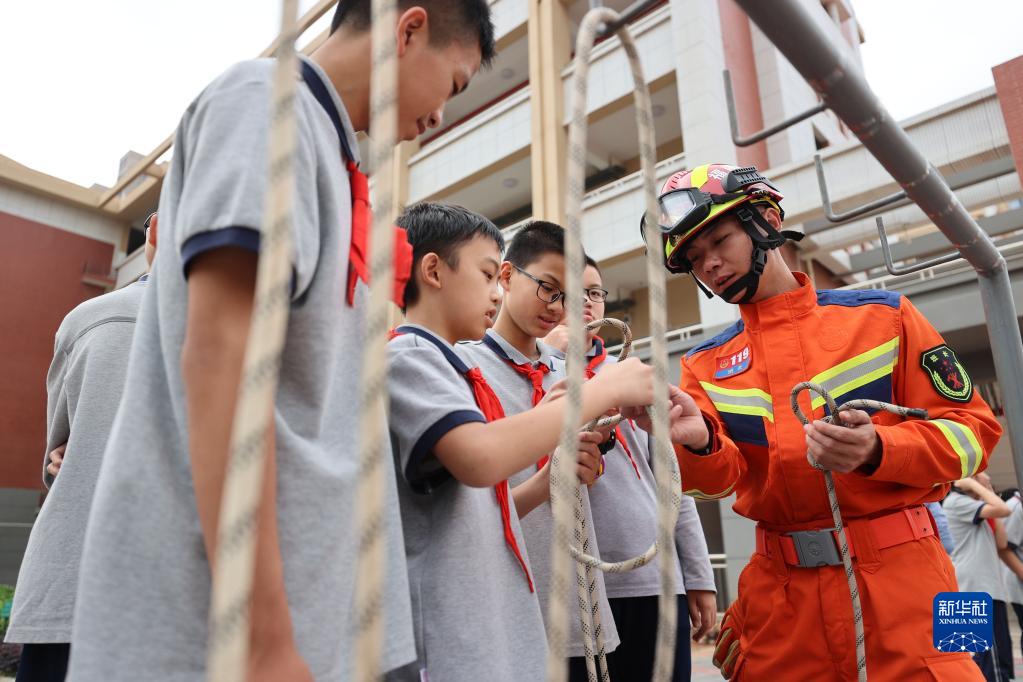 4月14日,在福建省廈門(mén)雙十中學(xué)翔安附屬學(xué)校,消防員指導學(xué)生學(xué)習救生結繩法。