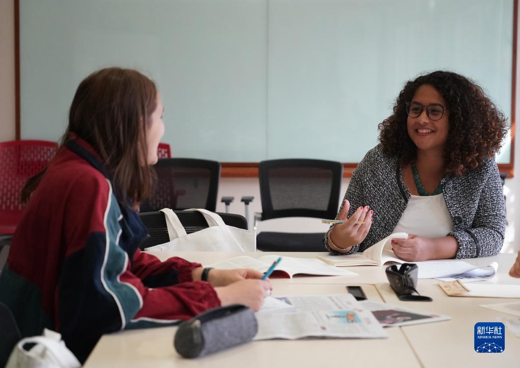 3月31日,葉籣(右)和微微在北京大學(xué)燕京學(xué)堂的一間教室討論。