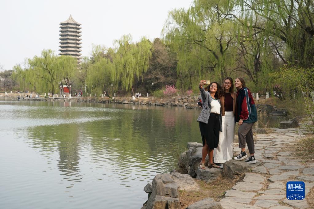 3月31日,葉籣(左)、馬努(中)和微微在北京大學(xué)未名湖旁合影。