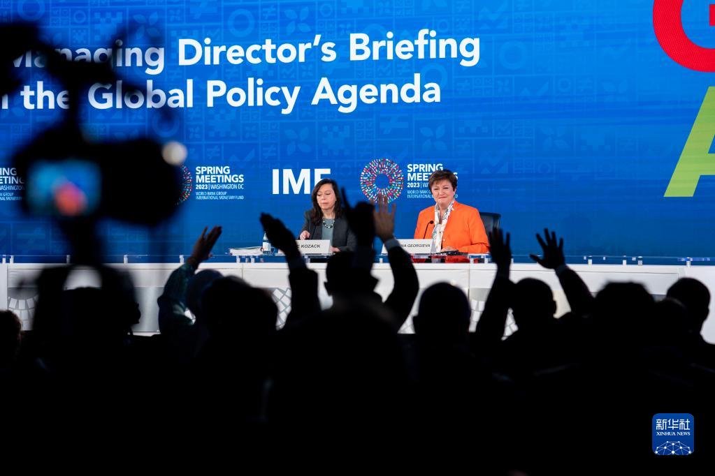 4月13日,在美國華盛頓,國際貨幣基金組織(IMF)總裁格奧爾基耶娃(右)出席記者會(huì )。