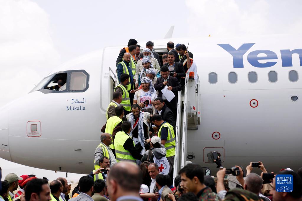 4月14日,在也門(mén)薩那機場(chǎng),獲釋胡塞武裝成員戰俘走下飛機。
