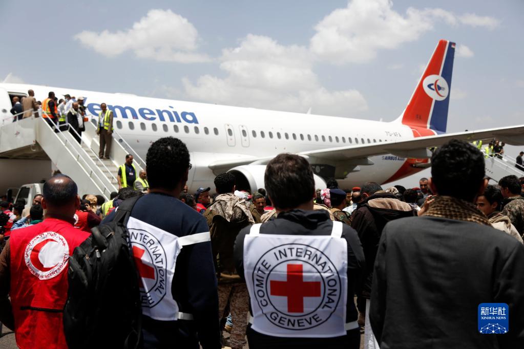 4月14日,搭載獲釋胡塞武裝成員戰俘的飛機抵達也門(mén)薩那機場(chǎng)。