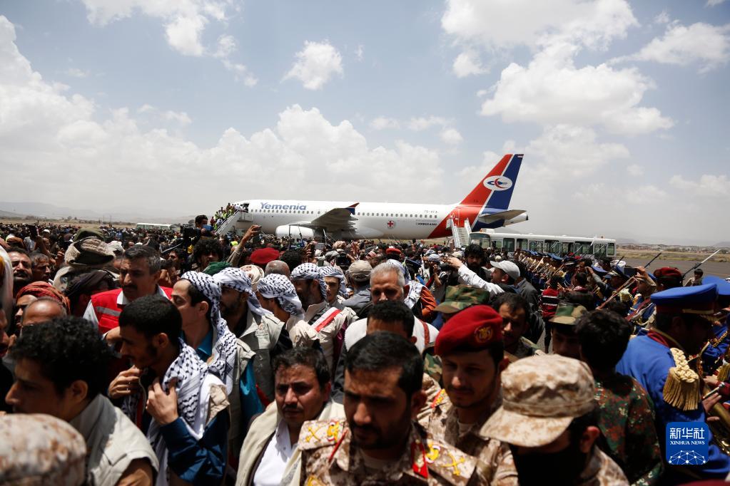 4月14日,在也門(mén)薩那機場(chǎng),人們迎接獲釋的胡塞武裝成員戰俘。