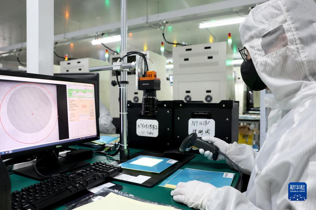 4月14日,一位工人在江蘇省射陽(yáng)縣江蘇暖陽(yáng)半導體科技公司LED芯片生產(chǎn)車(chē)間工作。