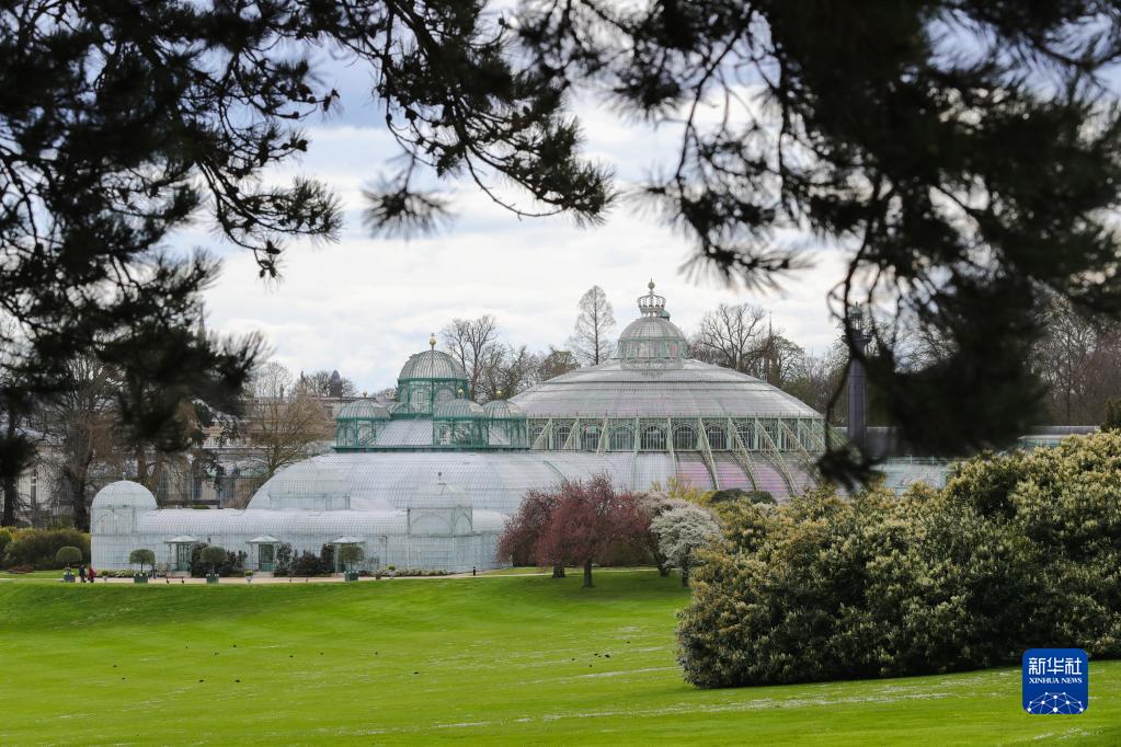 這是4月14日在比利時(shí)布魯塞爾拍攝的拉肯宮王家溫室花園。