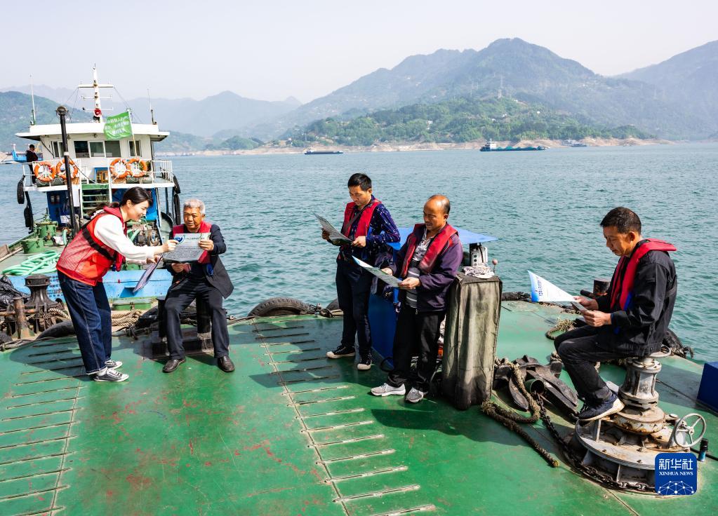 4月15日,湖北省宜昌市生態(tài)環(huán)境局秭歸縣分局工作人員在秭歸港??康拇吧?,為船員發(fā)放宣傳單,講解生態(tài)環(huán)保相關(guān)法律知識。