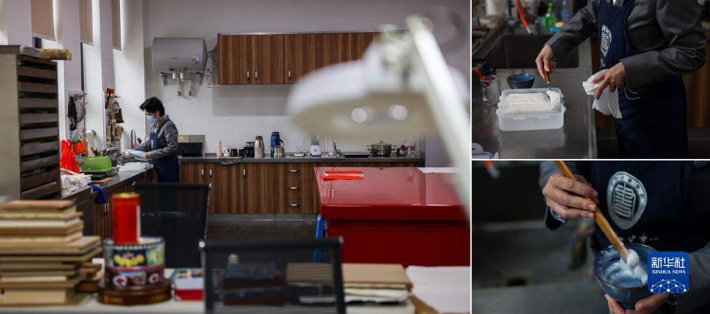 拼版照片:4月14日,在廣西壯族自治區圖書(shū)館古籍保護中心的工作室內,黃玉杏在修補工作開(kāi)始前調制漿糊。