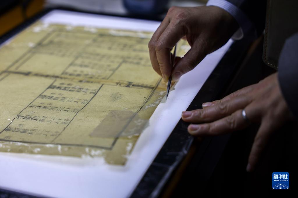 4月14日,在廣西壯族自治區圖書(shū)館古籍保護中心的工作室內,黃玉杏使用鑷子修補古籍。