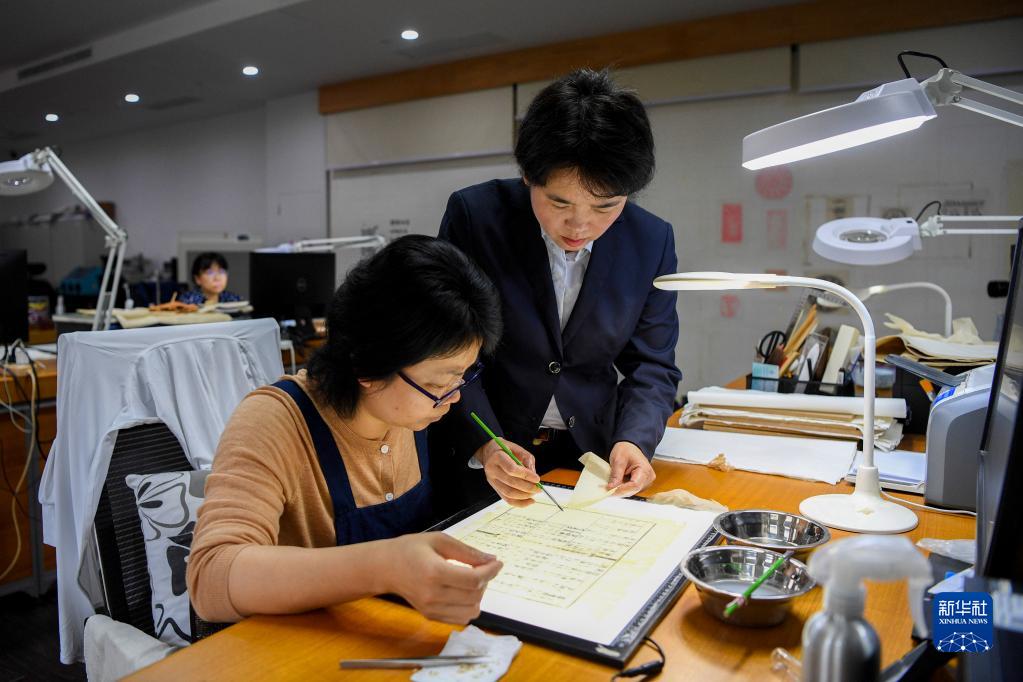 4月14日,在廣西壯族自治區圖書(shū)館古籍保護中心的工作室內,黃玉杏(右)與同事交流古籍修復工作的細節。