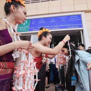 4月13日,在老撾磨丁站,工作人員歡迎乘坐D887次國際旅客列車(chē)的旅客。