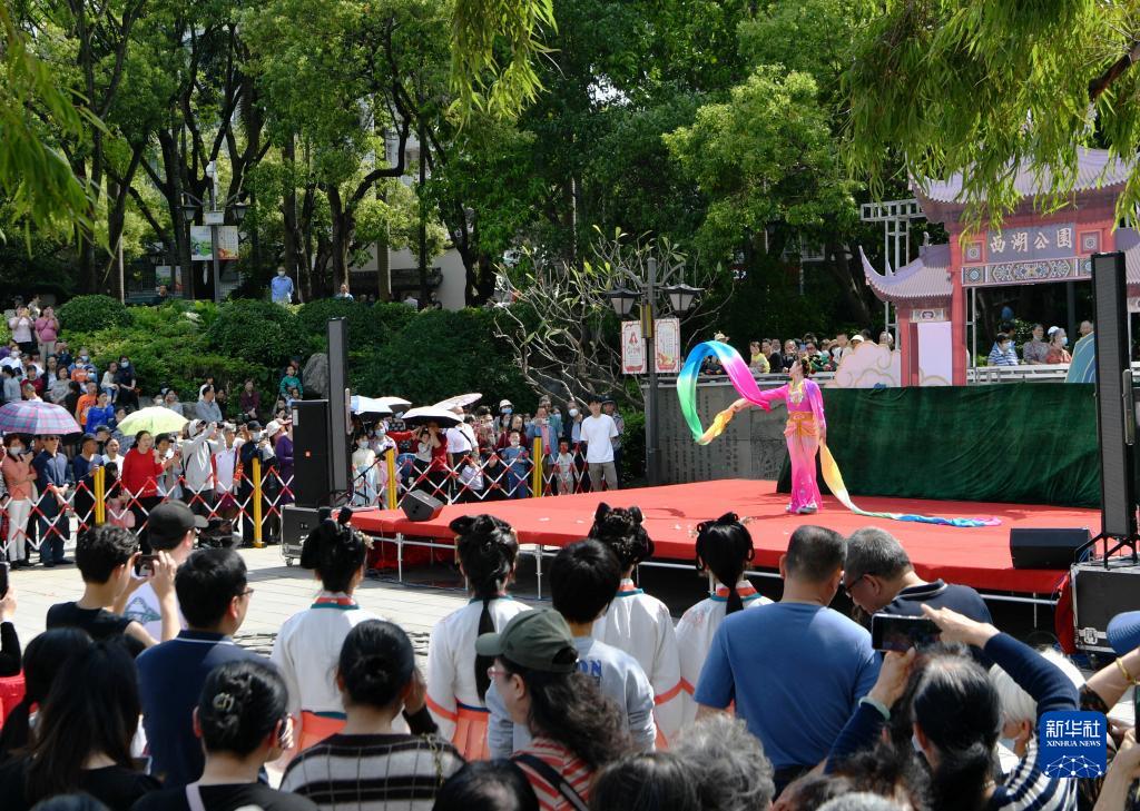 4月15日,在福州西湖上巳節啟動(dòng)儀式現場(chǎng),市民游客在觀(guān)賞舞蹈《天女散花》。