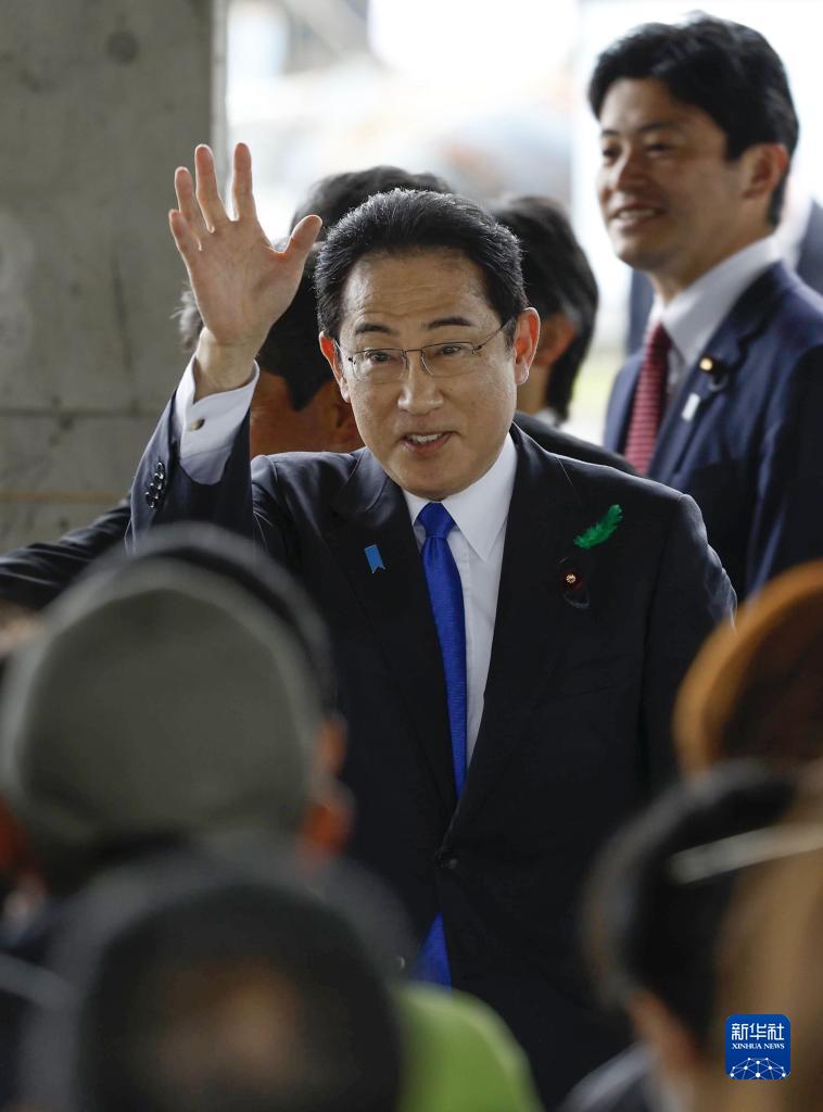 4月15日,在日本和歌山縣和歌山市雜賀崎漁港,日本首相岸田文雄向現場(chǎng)人群揮手致意。