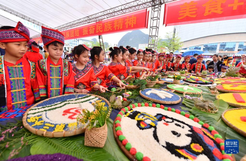 4月15日,小學(xué)生在廣西河池市大化瑤族自治縣江濱文化廣場(chǎng)觀(guān)看“五色糯米飯”參賽作品。