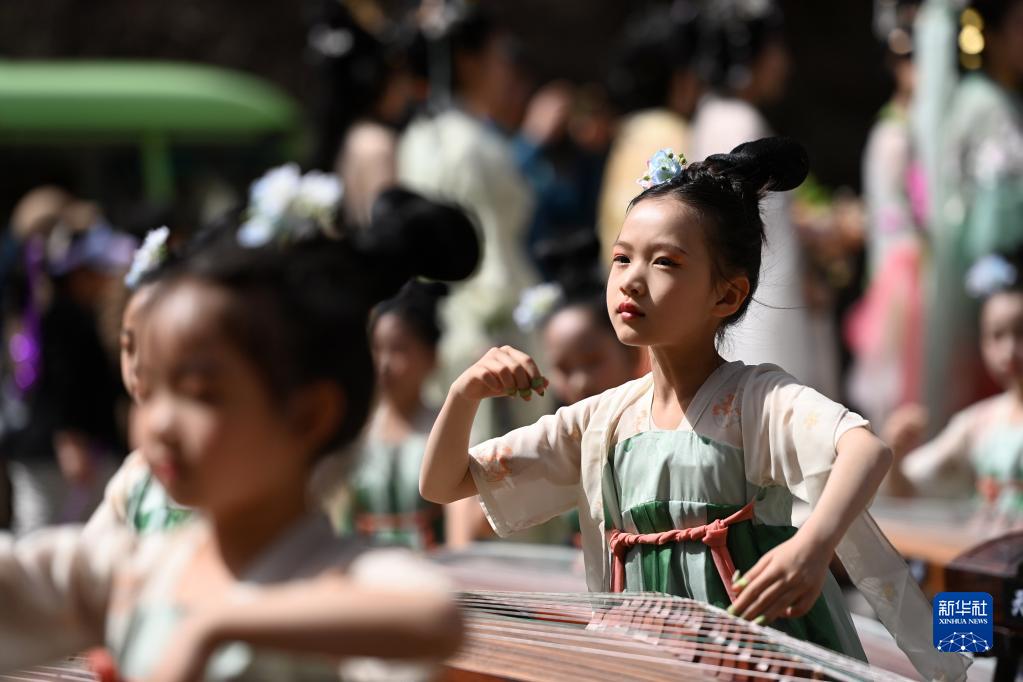 4月15日,小朋友在天津市薊州區梨木臺景區內進(jìn)行古箏表演。