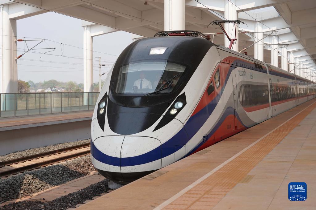 4月15日,中老鐵路列車(chē)駛出老撾萬(wàn)象站。