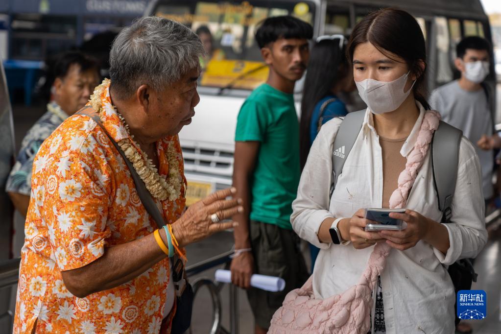 4月13日,在泰國廊開(kāi),泰國司機英(左)向一名準備搭乘中老鐵路列車(chē)的泰國游客介紹如何前往萬(wàn)象車(chē)站。新華社記者 林昊 攝