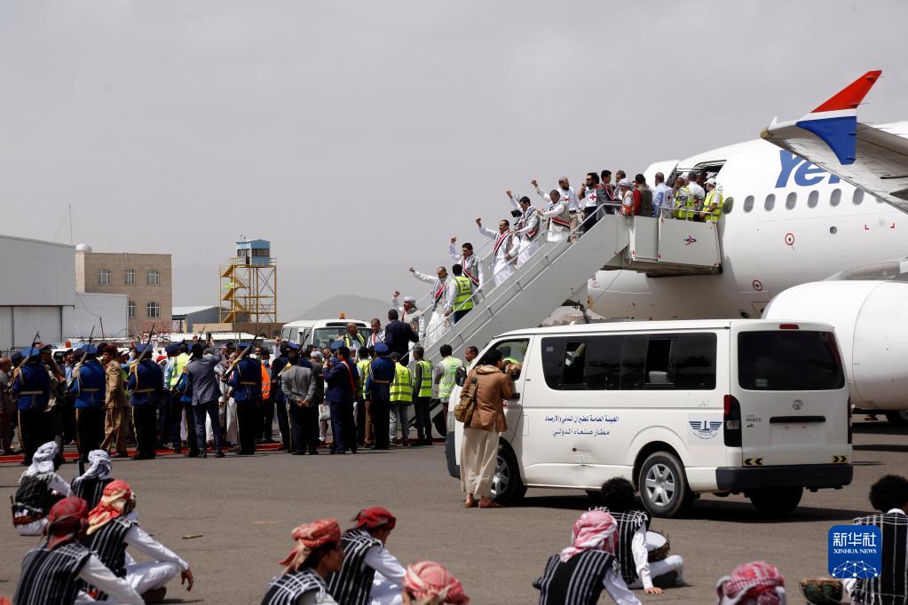 4月15日,在也門(mén)薩那機場(chǎng),獲釋胡塞武裝戰俘走下飛機。