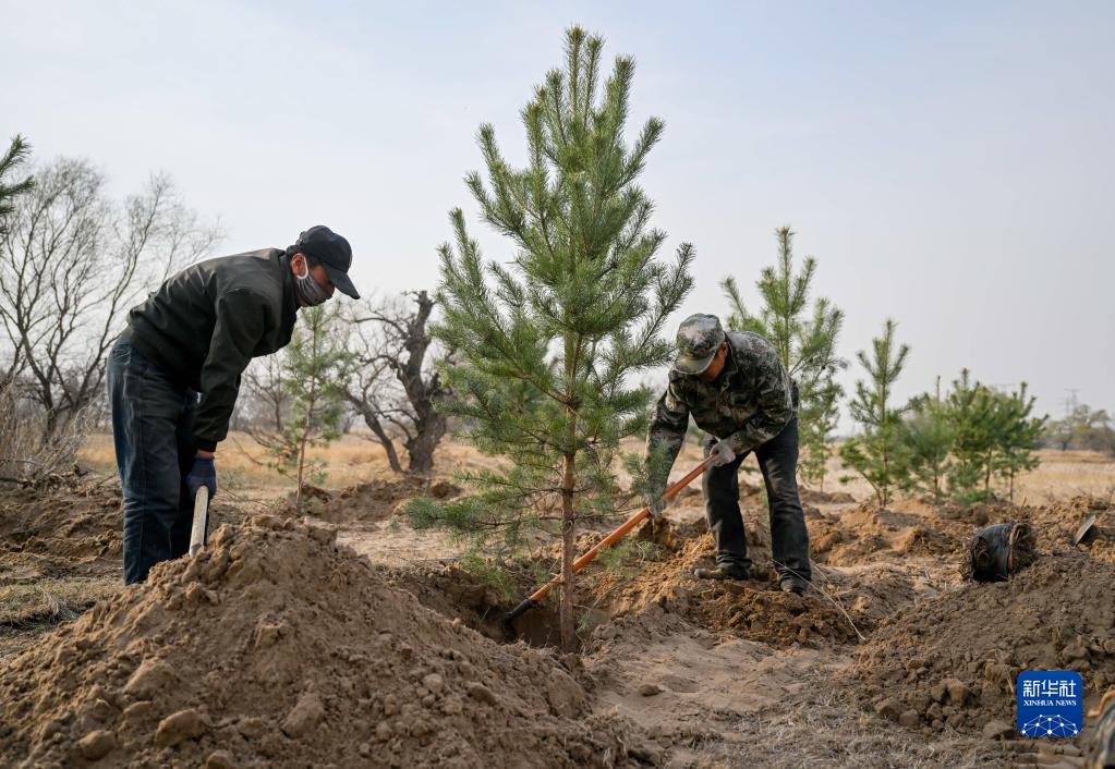 4月15日,在內蒙古通遼市科爾沁左翼后旗,治沙工人在科爾沁沙地植樹(shù)造林。