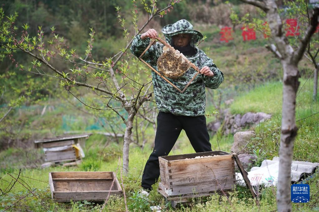 村黨支部書(shū)記吳竹林在查看蜂箱(4月6日攝)。