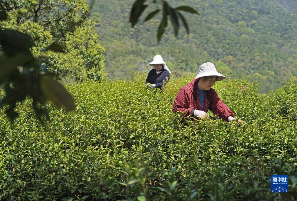 村民在港背村的茶園里采摘春茶(4月7日攝)。
