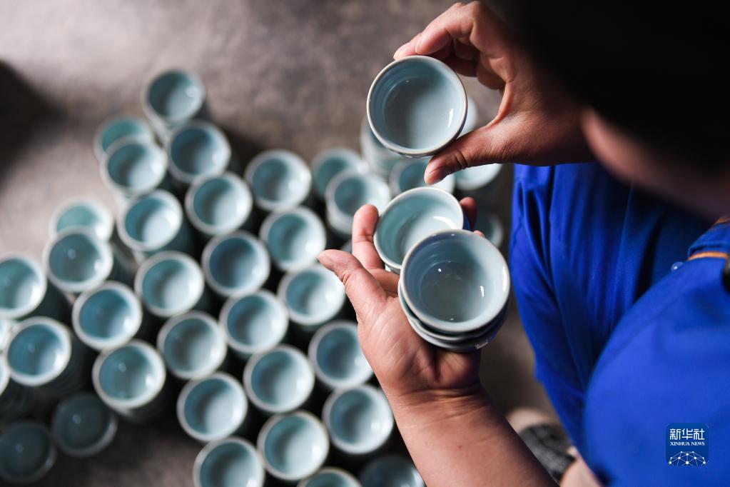 4月13日,在河南省汝州市一家汝瓷生產(chǎn)車(chē)間內,工人在進(jìn)行汝瓷產(chǎn)品出廠(chǎng)檢驗。