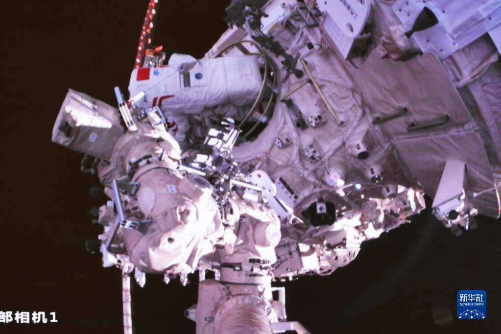 4月15日在北京航天飛行控制中心拍攝的神舟十五號航天員費俊龍開(kāi)展艙外操作的畫(huà)面。