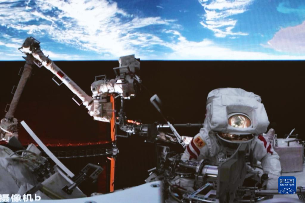 4月15日在北京航天飛行控制中心拍攝的神舟十五號航天員費俊龍成功出艙的畫(huà)面。