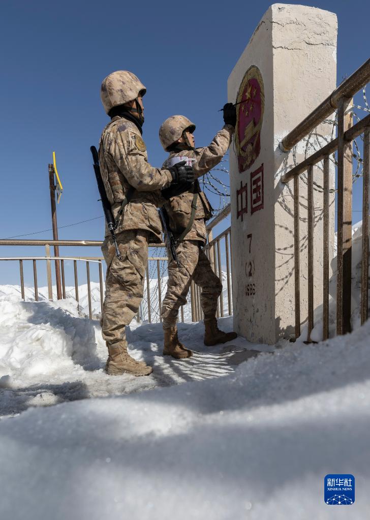 4月13日,周林平(右)和高光輝執勤時(shí)給界碑描紅。