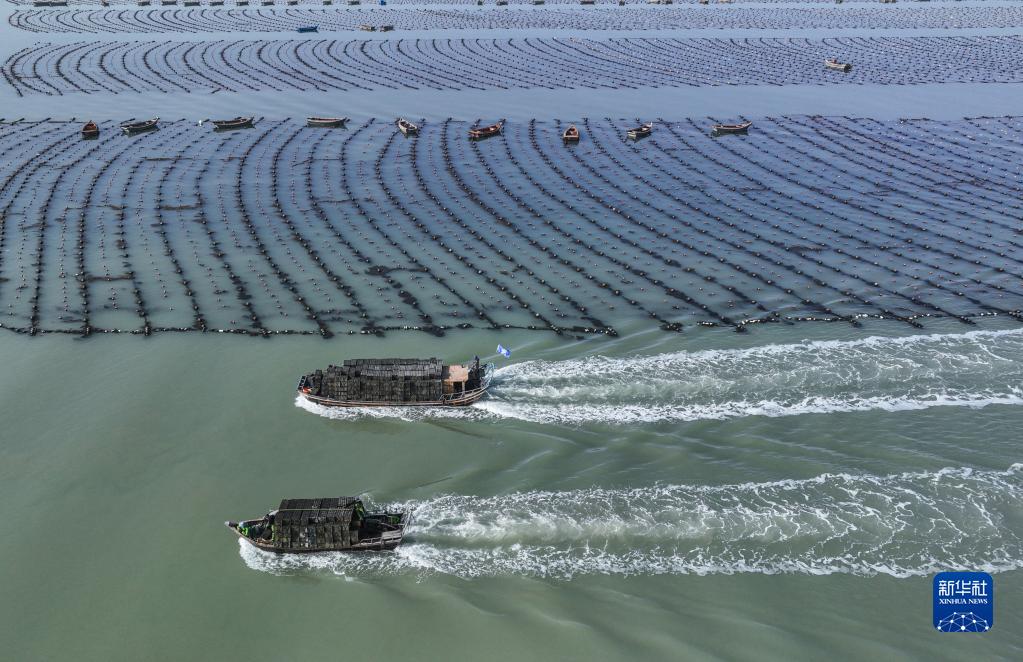 4月16日,在山東省榮成市愛(ài)倫灣海域,養殖工人們駕駛漁船將鮑魚(yú)運送至海區繼續養殖(無(wú)人機照片)。