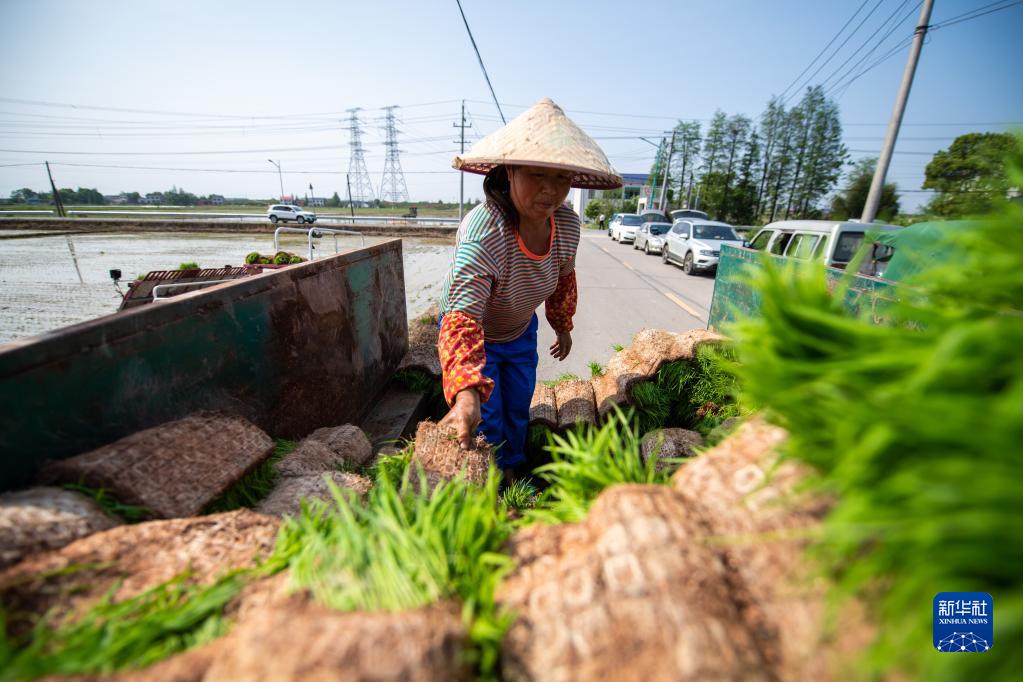 4月17日,在長(cháng)沙市望城區烏山街道黃花嶺村,村民在整理拖拉機上的秧苗。