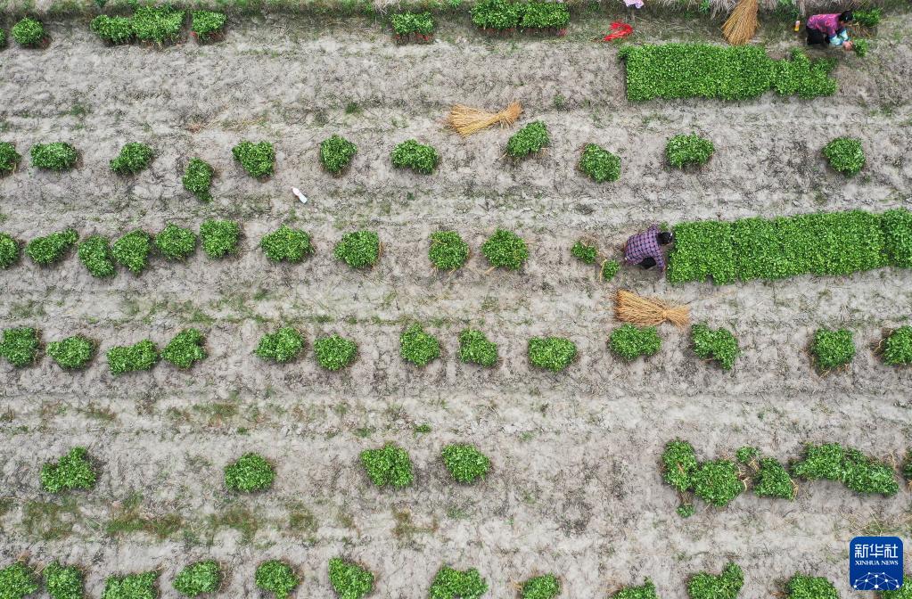 4月17日,村民在貴州省黔東南苗族侗族自治州從江縣剛邊壯族鄉良田村中藥材種植基地采收板藍根苗(無(wú)人機照片)。