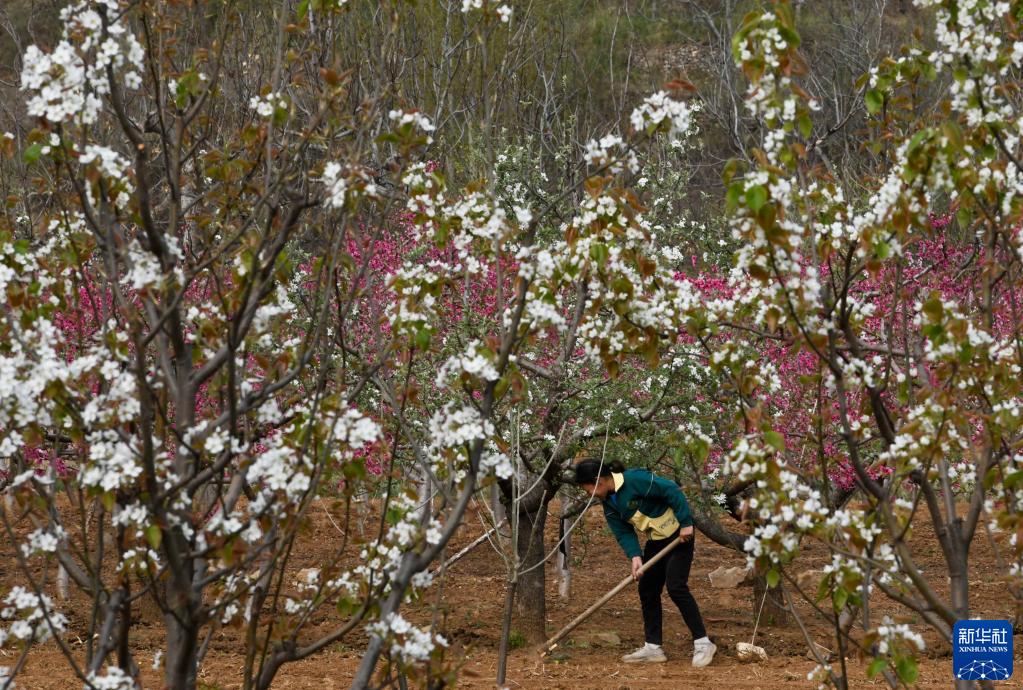 4月17日,河北省遵化市東舊寨鎮農民在果園勞作。