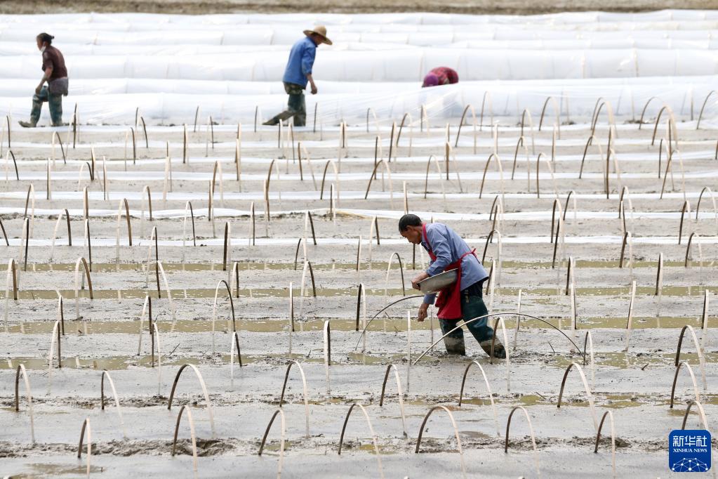 4月17日,重慶市黔江區鄰鄂鎮高坪村村民進(jìn)行水稻育秧勞作。