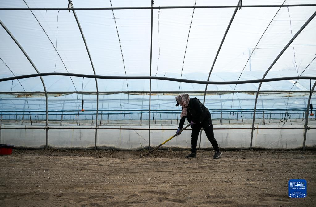 4月14日,在通遼市科爾沁左翼后旗甘旗卡鎮,工人在水稻育苗大棚里整理土地。