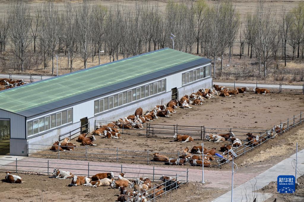 4月12日,在通遼市科爾沁左翼中旗一家肉牛種業(yè)公司,牛群在圈舍外曬太陽(yáng)。