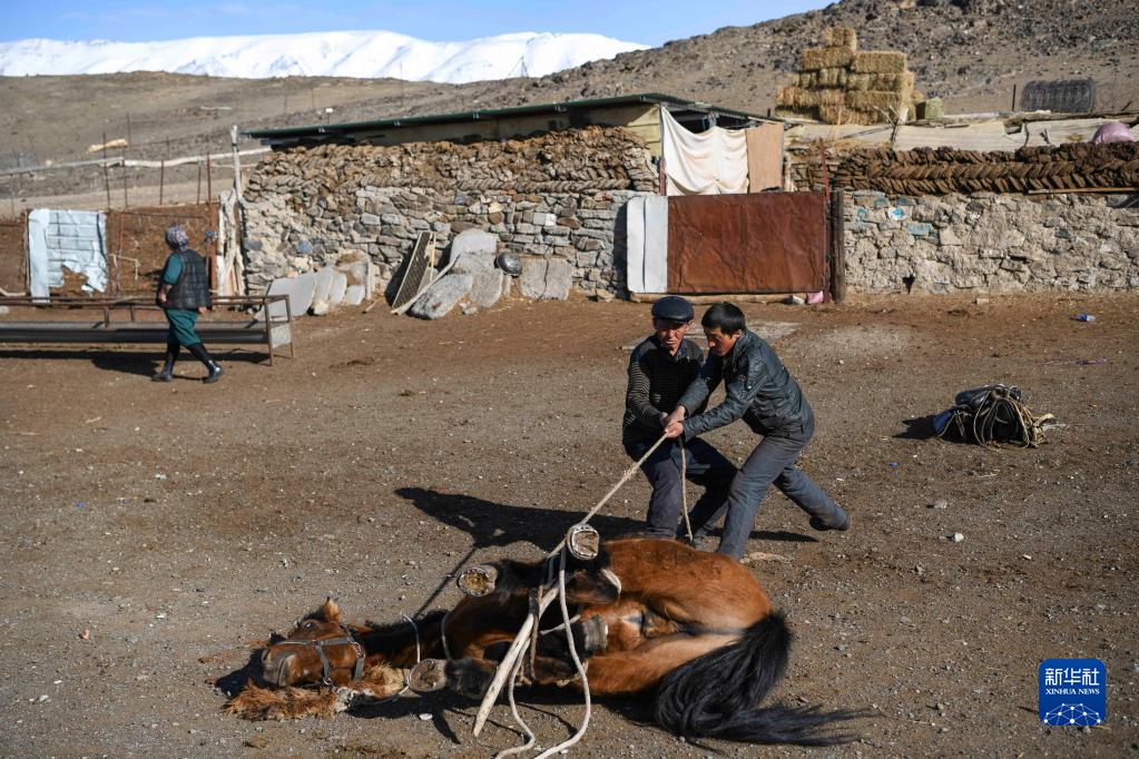 哈布得拉什么(前左)和兒子賽孜木合力把需要修理馬掌的馬匹翻身,巴哈提從一旁經(jīng)過(guò),去羊圈檢查是否有小羊羔出生(4月13日攝)。