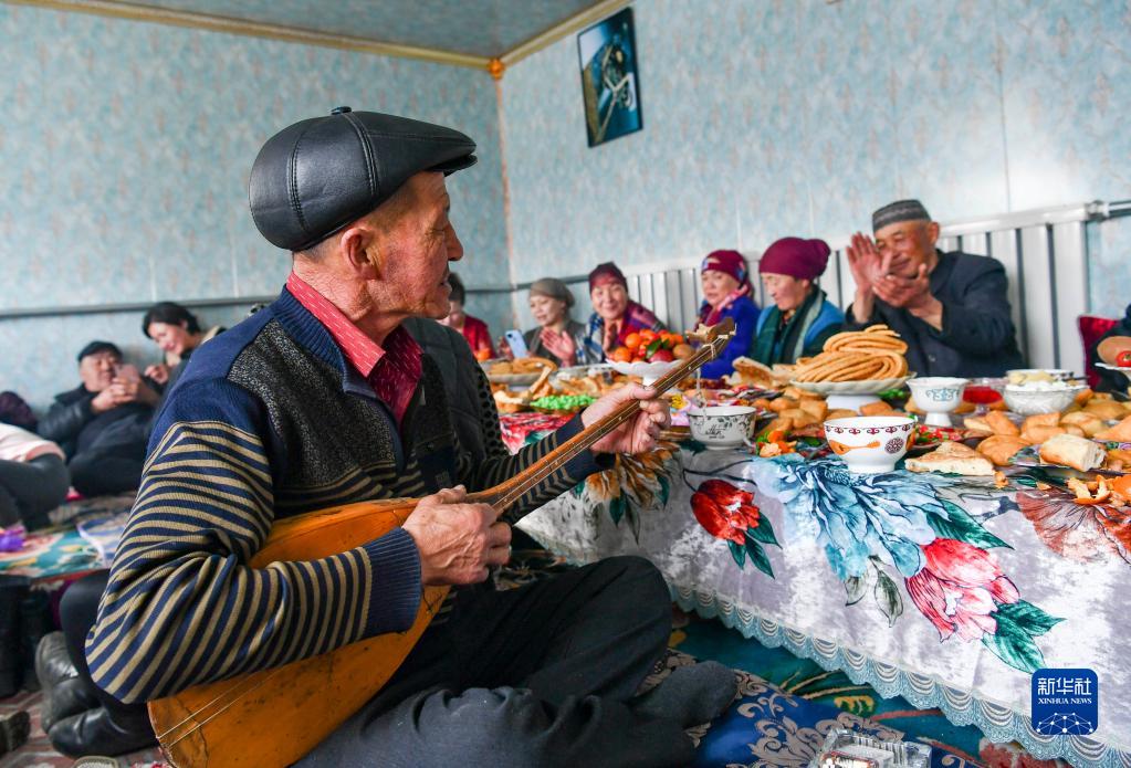 哈布得拉什么在“鄰里聚會(huì )”上為親朋好友彈奏冬不拉,引吭高歌(2月12日攝)。
