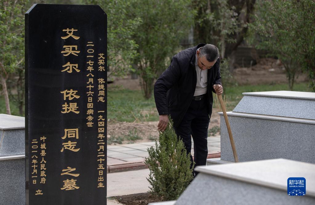 4月16日,艾尼瓦爾·艾買(mǎi)爾在查看自己父親墓旁的樹(shù)苗長(cháng)勢。