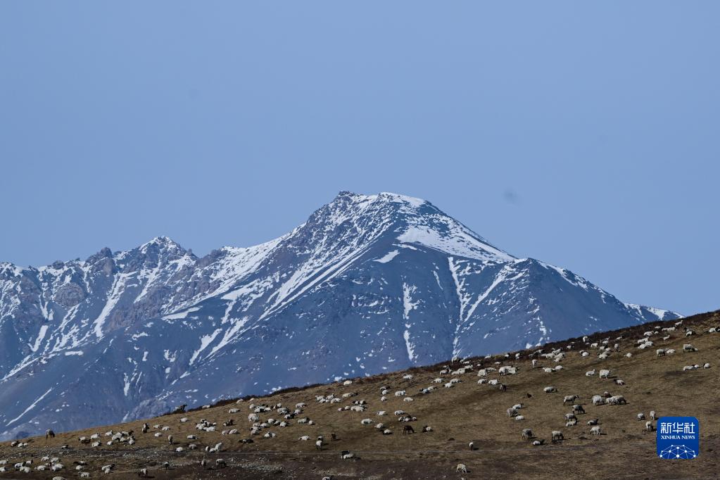 4月17日,在青海省海北藏族自治州門(mén)源回族自治縣皇城蒙古族鄉,一群藏羊在祁連山腹地的草場(chǎng)上活動(dòng)。