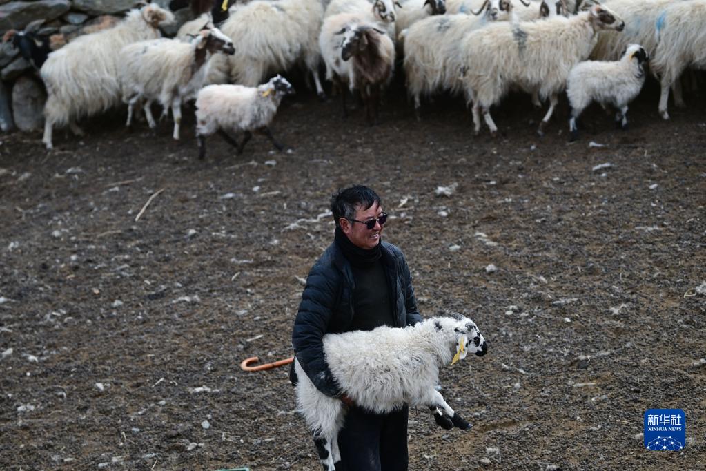 4月9日,在青海省海北藏族自治州祁連縣扎麻什鄉郭米村,牧民桑太才郎在羊圈中查看羊羔身體狀況。