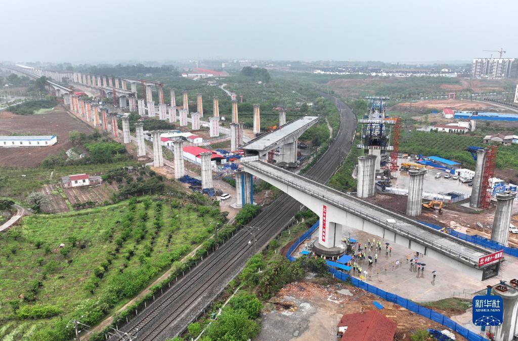 滬渝蓉高速鐵路荊門(mén)特大橋跨焦柳鐵路連續梁完成轉體(4月18日攝,無(wú)人機照片)。