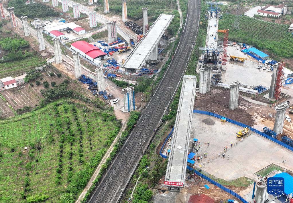 滬渝蓉高速鐵路荊門(mén)特大橋跨焦柳鐵路連續梁轉體前(4月18日攝,無(wú)人機照片)。