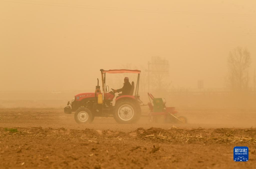 4月19日,農民在寧夏吳忠市同心縣河西鎮冒著(zhù)沙塵天氣播種玉米。