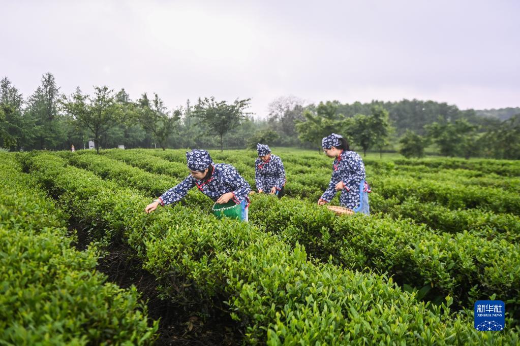 4月19日,在婺州舉巖茶產(chǎn)區,茶農們在采茶。