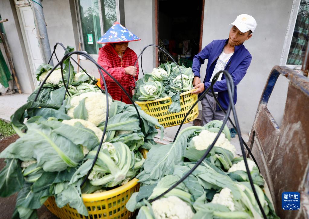 4月18日,在大湖鄉東姚村湖東果蔬農民專(zhuān)業(yè)合作社種植基地,村民將收獲的花菜裝車(chē)。
