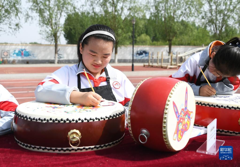 4月19日,門(mén)樓中心小學(xué)的學(xué)生在活動(dòng)中繪制鼓面。