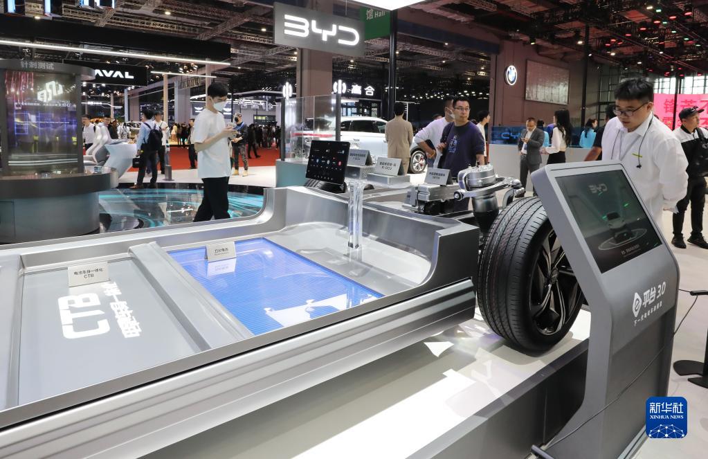 4月19日,參觀(guān)者在比亞迪汽車(chē)展臺觀(guān)看CTB電池車(chē)身一體化展示平臺。